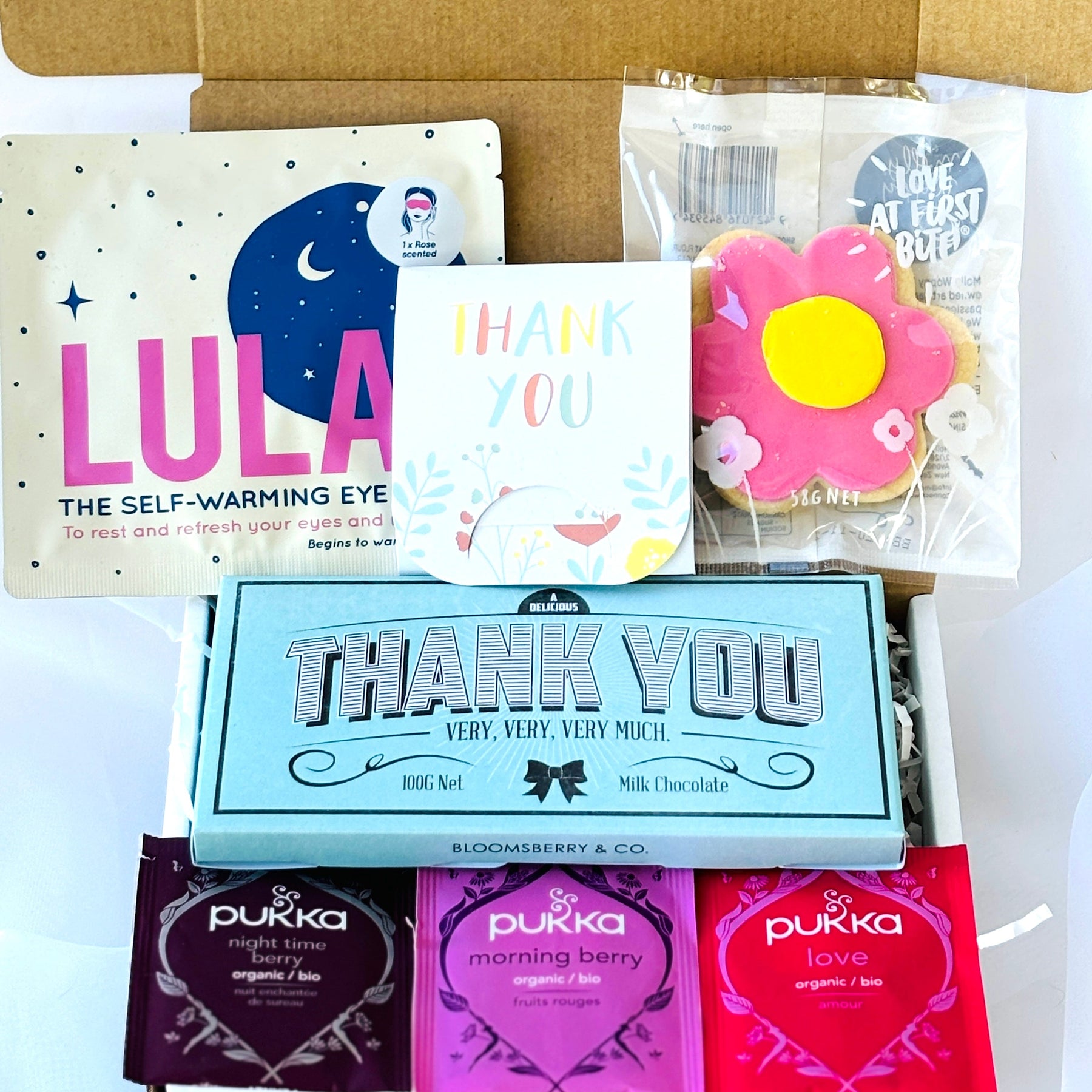 Assorted items including a 'Thank You' card, Lula self-warming eye mask, and Pukka tea bags on a white background.