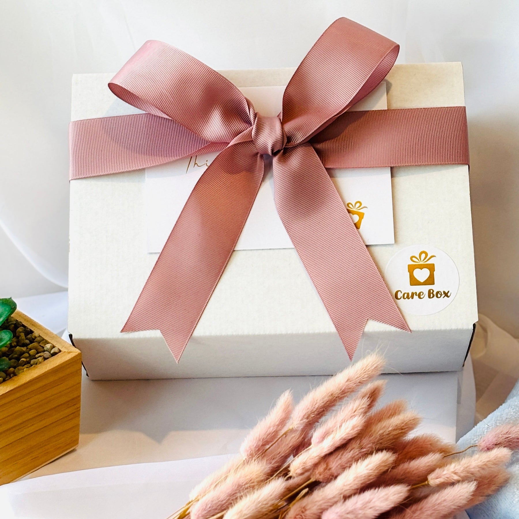 White box with a green ribbon and 'Care Box' logo on a light background